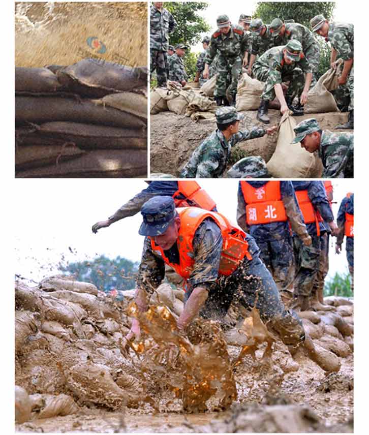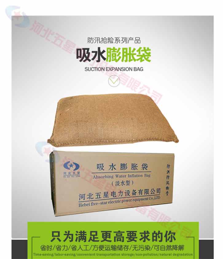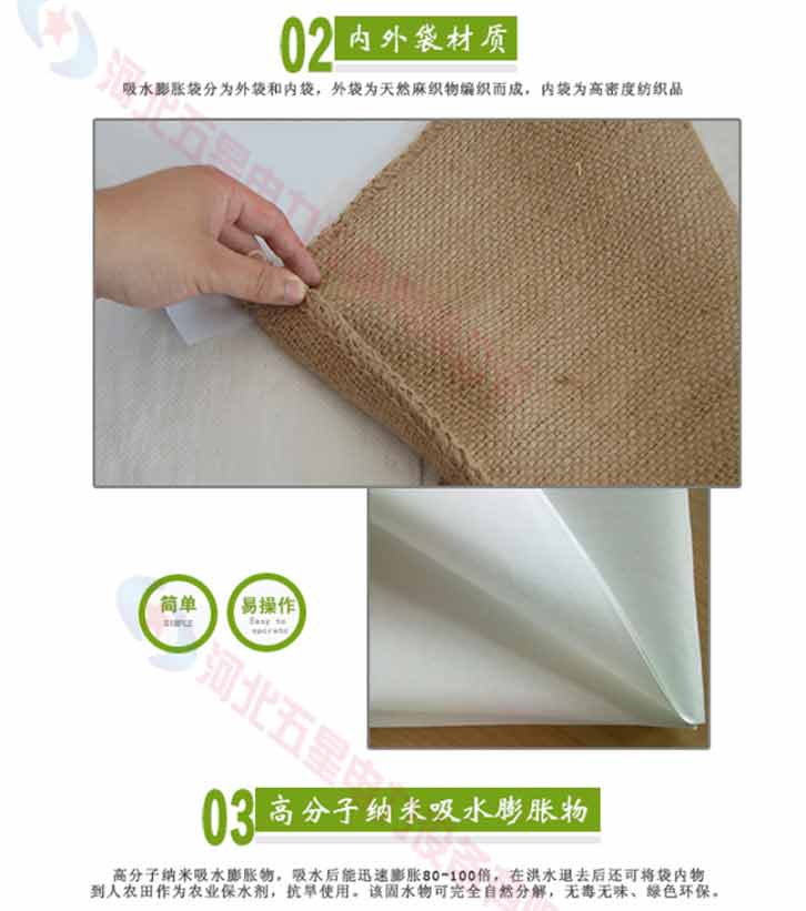 吸水膨脹袋內裝的是新型的高分子納米吸水物質,這種物質無毒、無味、無污染,吸水膨脹前為極小的顆粒物質,吸水后為黑豆大小的含水物質,干凈且無公害,待高分子吸水物質使用后可用于農業保水抗旱,所以在洪水過后可就地將袋內的物質傾倒入農田中,在泥土中可完全分解,是綠色環保、一舉兩得的首選產品。外袋為純麻布和棉布織成,遇水后麻繩可更加結實耐磨。